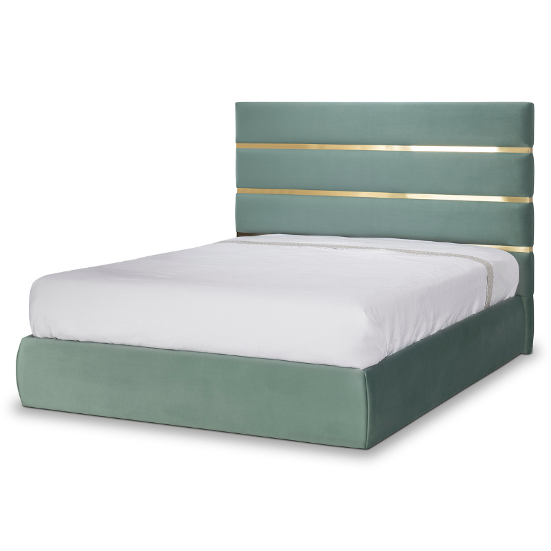 Cama fabricada em MDF com acabamento estofado e pormenores em Inox latonado.